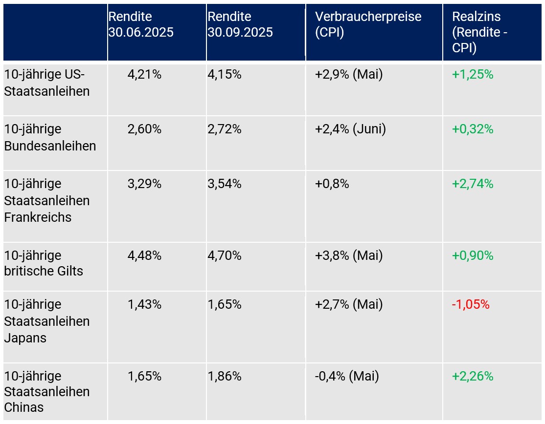 Die Rendite der 10-jährigen Bundesanleihe stieg im Quartalsvergleich von 2,60 % auf aktuell 2,72 % und die 10-jährige britische Staatsanleihe von 4,48 % auf 4,70 %. Anders war das in den USA. Dort kam es im 3. Quartal 2025 zu einem Rückgang von 4,21 % auf 4,15 %.